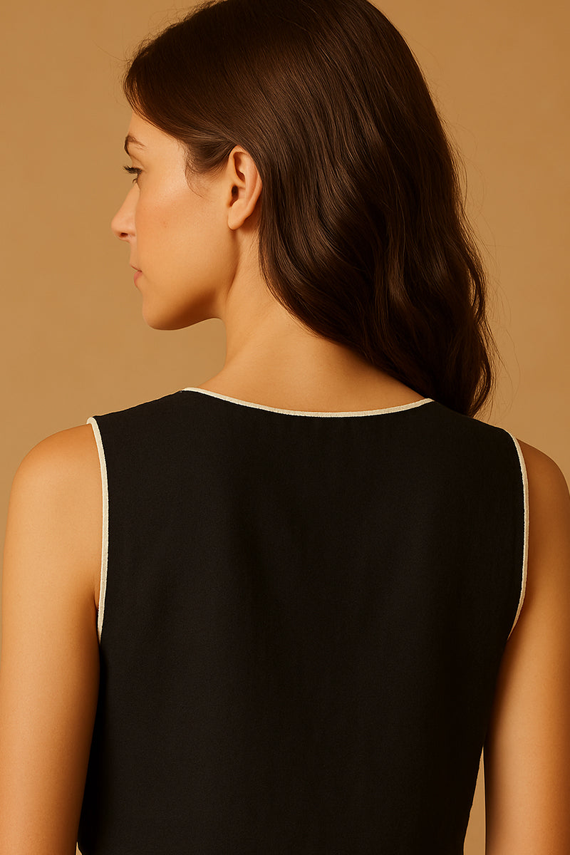 Meet Zemira — a sleeveless vest-style top handcrafted in jet-black Irish linen and brought to life with playful ivory dori embroidery. Every abstract swirl and bloom tells a story, lending it a bold, artisanal edge. The open front and structured silhouette make it an ideal layering piece over basic tanks, linen tunics, or even dresses.