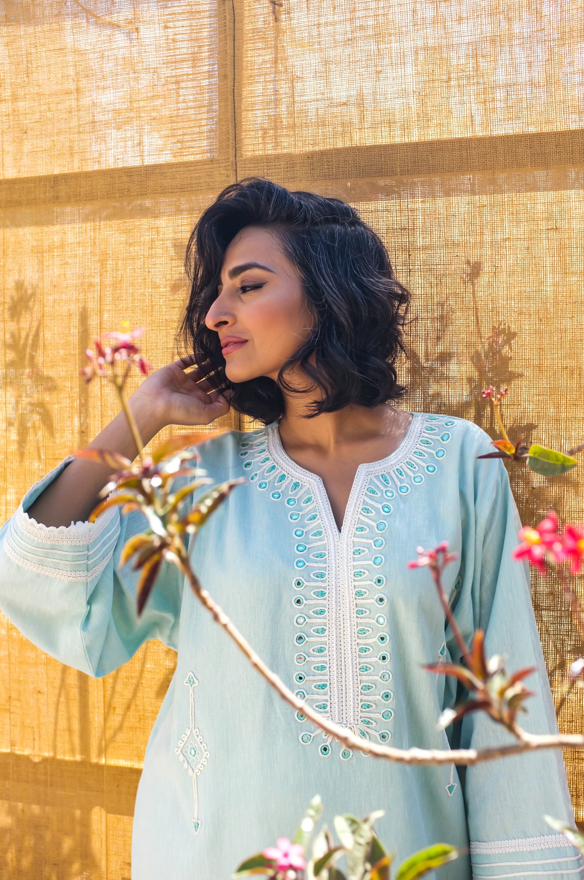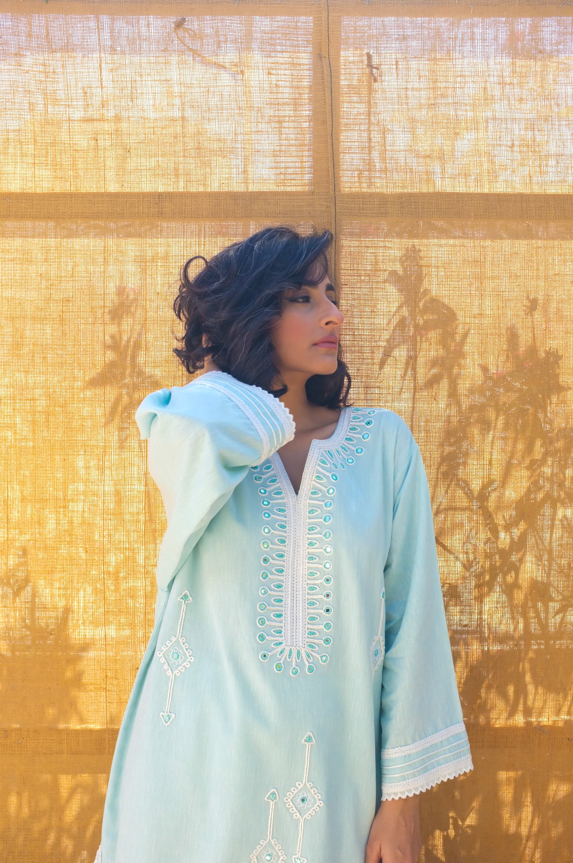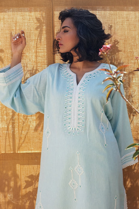 Ziba is a relaxed cut kurta with dori and mirror embroidery finished with lace detailing.