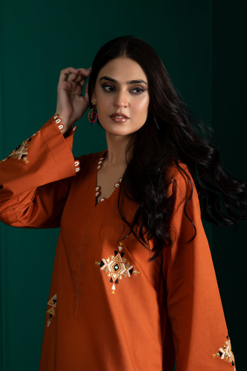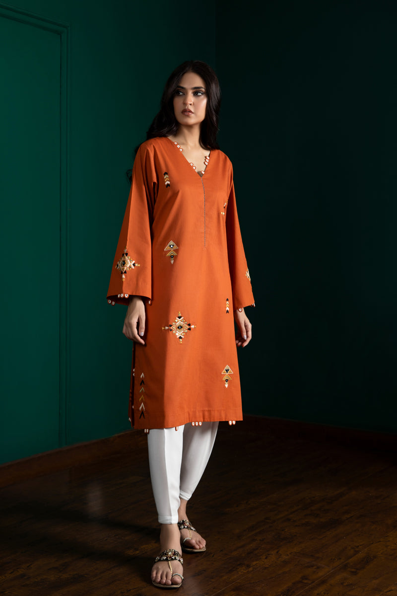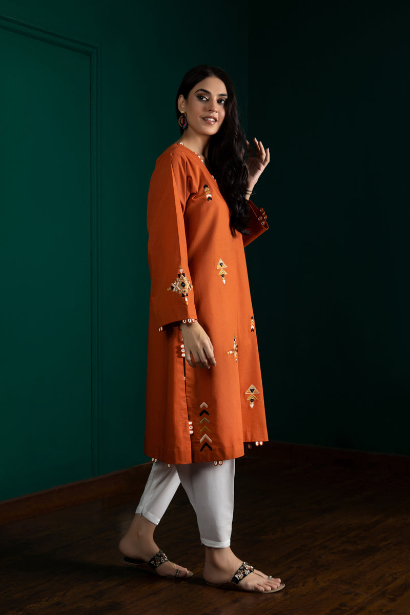 Boho-chic Zoreh kurta, featres a tribal insprired embroidery with mirror and scalloped detailing, Style your kurta with skinny shalwar or azaar pants.