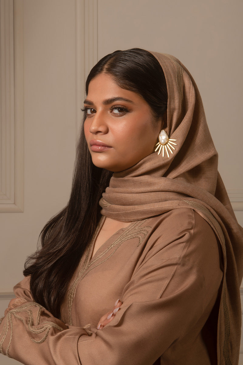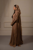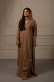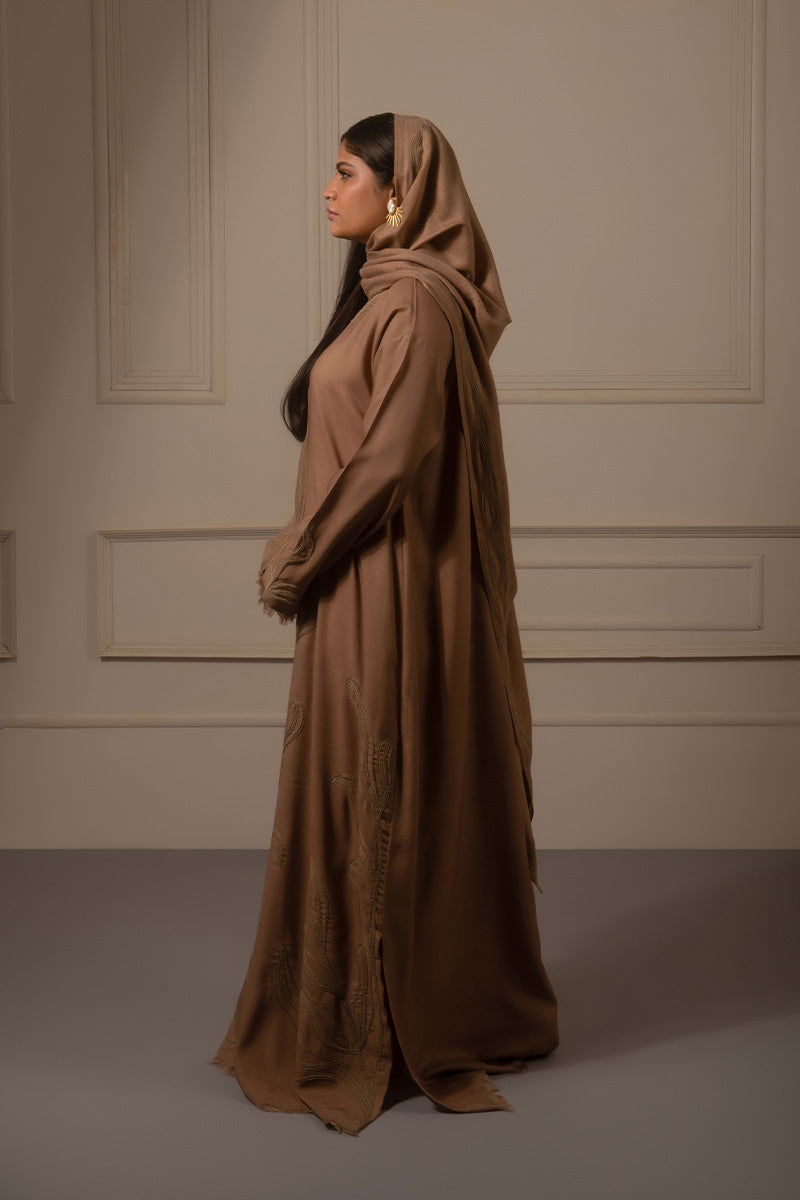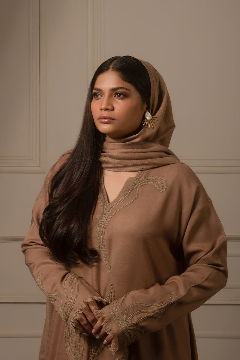 A serene earth-toned kaftan in Irish linen, with organic, free-flowing dori embroidery that mimics natural forms. The soft drape and full-length design exude understated grace, complemented by a delicate head stole for a truly modest and refined look.